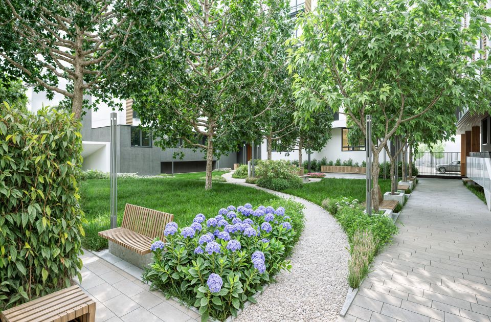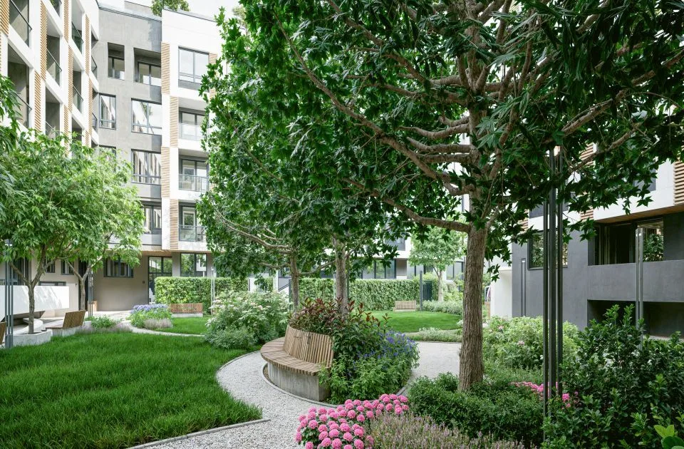 Više od 1.700 kvadratnih metara predviđeno je za zelene površine, uključujući dva dvorišta, krovne terase i privatne bašte stanova u prizemlju.