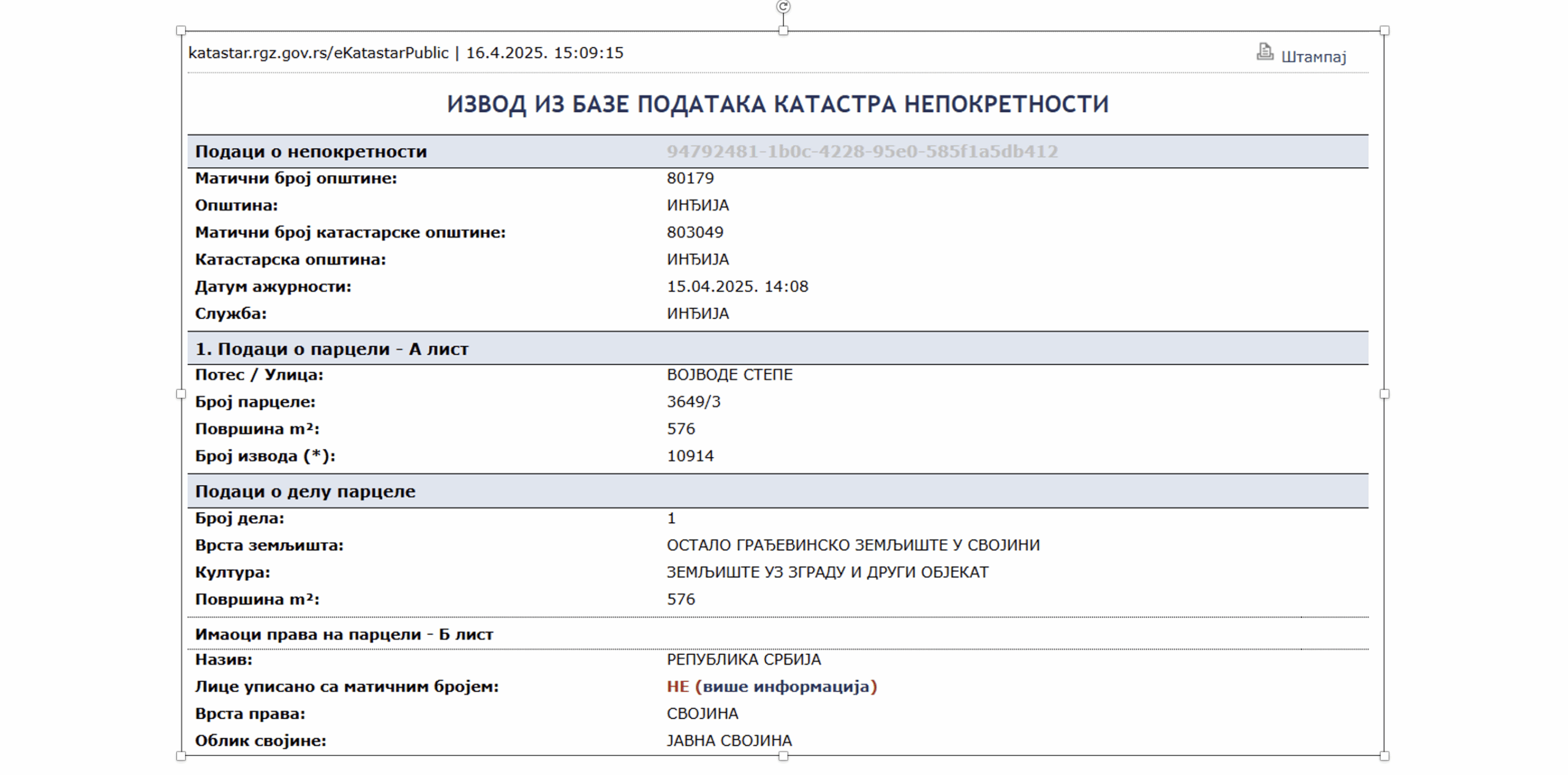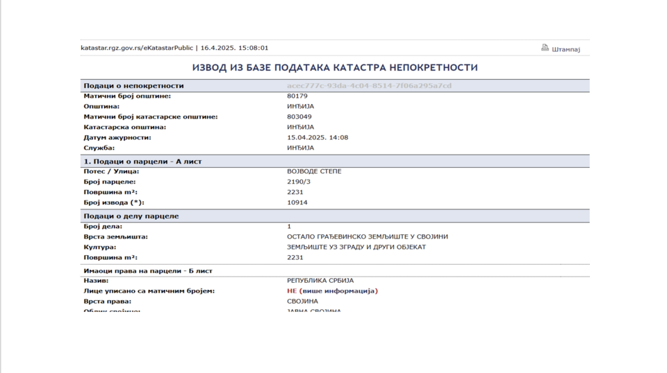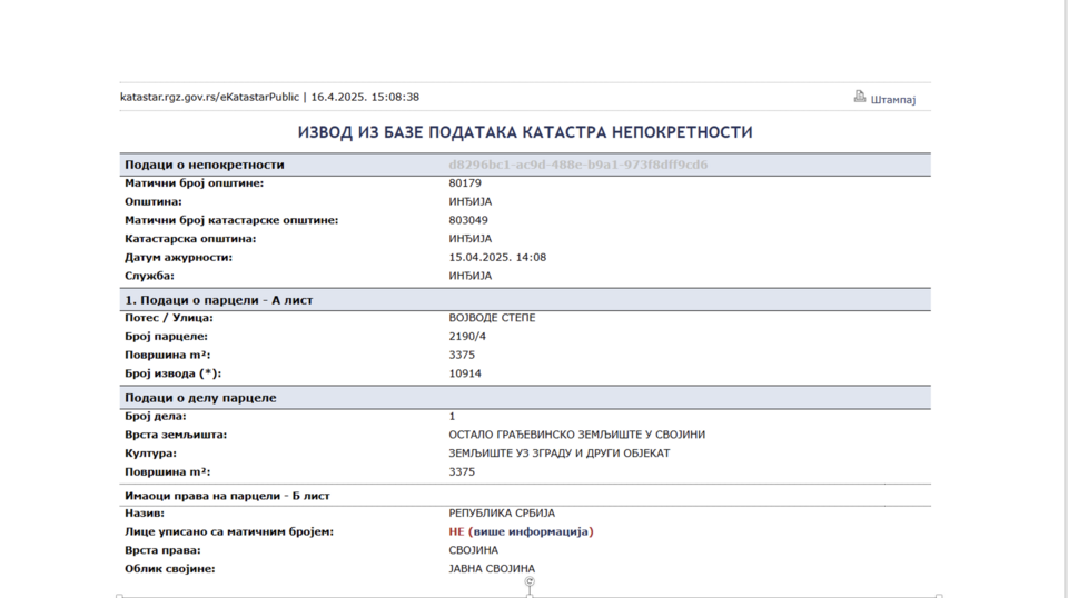 Prema podacima Republičkog geodetskog zavoda, ove parcele su u ponovnom vlasništvu Republike Srbije, a iz katastra je vidljivo da trenutno nisu u skladu sa planiranom urbanističkom namenom.