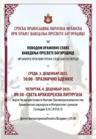 Srpska pravoslavna parohija inđijska organizuje obeležavanje hramovne slave Vavedenja Presvete Bogorodice prema utvrđenom programu.